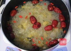- 待银耳炖至软烂时,加入红瓜块,继续炖煮20分钟。